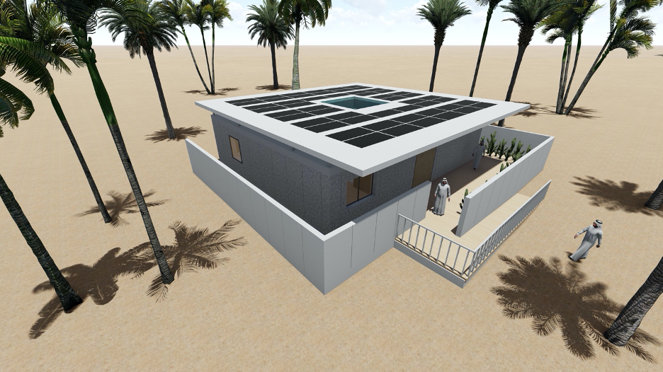 The starting point of our project is to deal with the high temperature, less rain climate in the Middle East, and we hope to build a house with a combination of active technology and passive technology. Inspires by the local traditional atrium house, we design a terrace roof house with an atrium as a climate buffer space, then add electric aluminum plates to simulate the "X" shaped wind catcher partitions in the ventilation layer between the two roofs, they can automatically rotate to gather wind into the rooms.